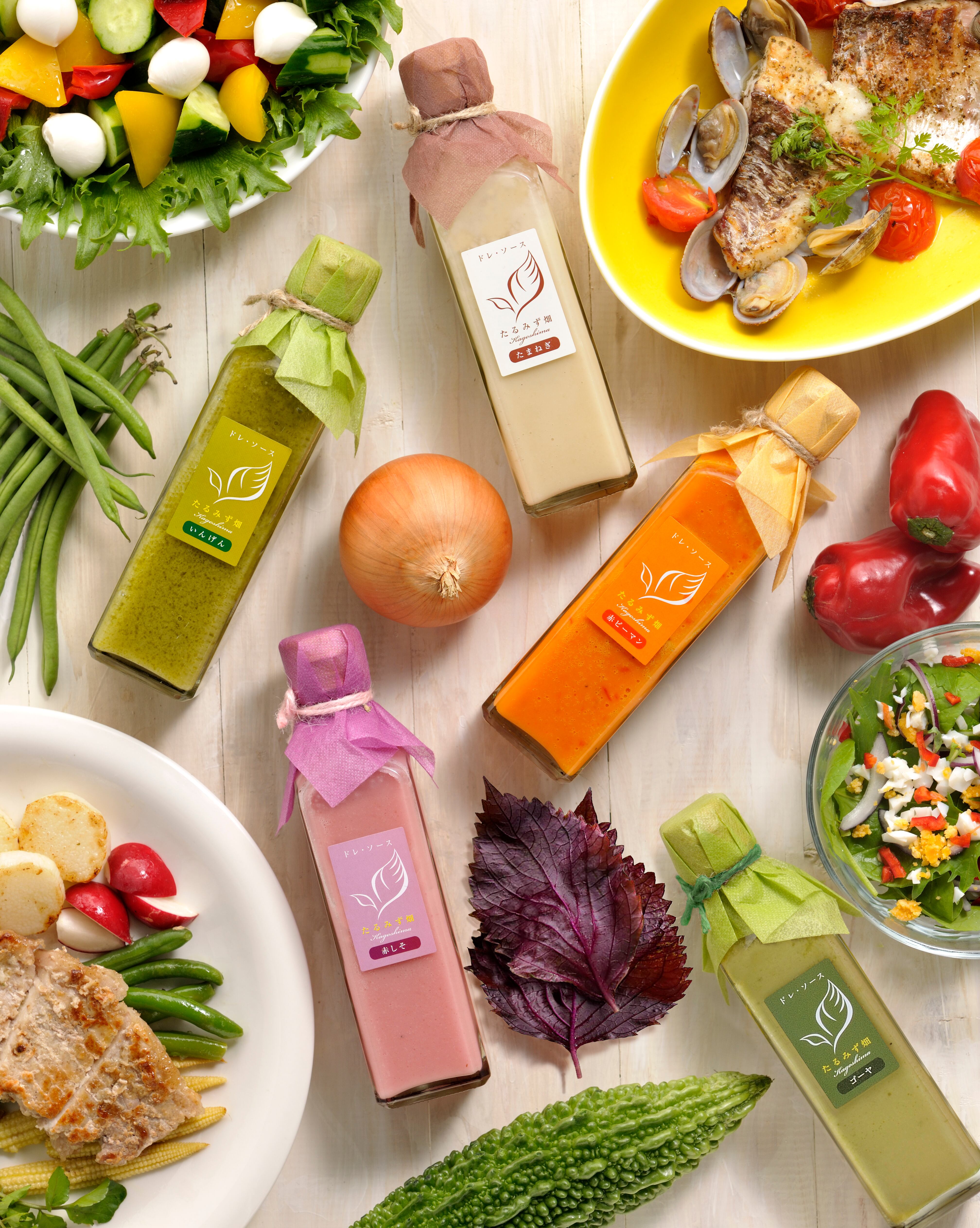 3種類(ゴーヤ・たまねぎ・赤しそ)のドレ・ソースの詰め合わせ。